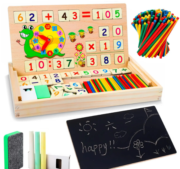 Contém: caixa organizadora em madeira, peças com números e símbolos matemáticos, varetas coloridas para contagem, tabuada completa, relógio educativo com ponteiros móveis e lousa com giz e apagador.