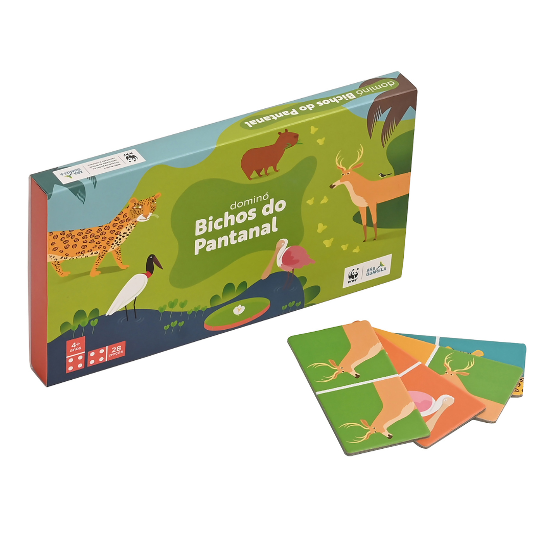 No Dominó Bichos do Pantanal as crianças vão se divertir com a onça-pintada, o colhereiro, o cervo-do-pantanal e muitos outros animais que vivem nesse incrível bioma. Nesse jogo pode-se jogar de duas formas, uma adaptação com as ilustrações para os mais novos e do outro lado o dominó tradicional, mais desafiador.