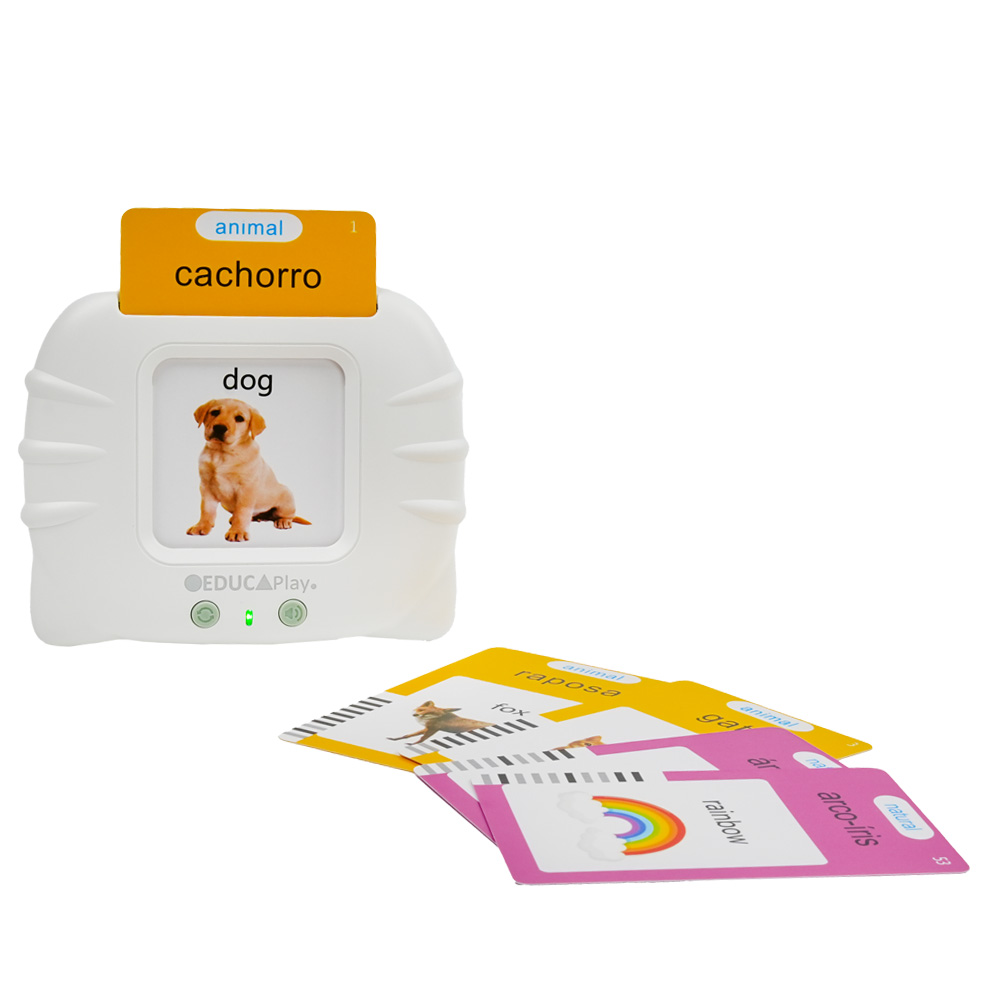 O funcionamento é simples: basta inserir uma carta no dispositivo para ouvir a pronúncia correta da palavra nos dois idiomas. O jogo possui 112 cartas ilustradas, totalizando 448 palavras do cotidiano (224 em português e 224 em inglês), organizadas em 12 categorias temáticas que facilitam a memorização e ampliam o vocabulário infantil, como animais, veículos, verduras, frutas, cores, profissões, dentro outras.
