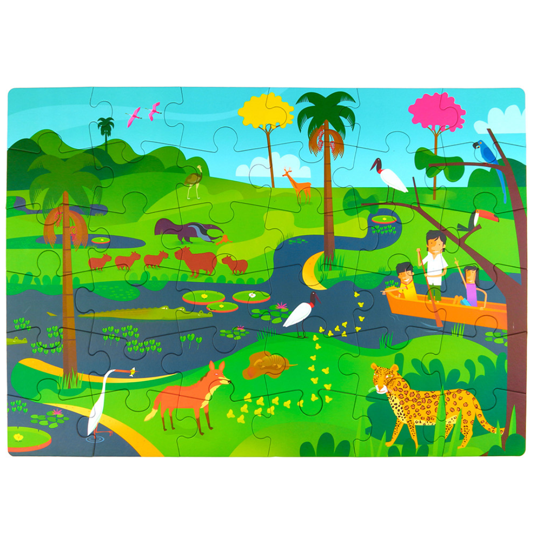 Você sabia que boa parte da maior área úmida continental do planeta fica aqui no Brasil? Com o Quebra-Cabeça Bichos do Pantanal da Araquarela, as crianças são convidadas a explorar essa paisagem exuberante de rios e campos alagados, além dos personagens ilustres da fauna pantaneira como o tamanduá, o lobo guará e o tuiutuiú. São 36 peças grandes e robustas que auxiliam na montagem pelos pequenos. Quando finalizado, o quebra-cabeça atinge 69x49 cm e é uma divertida ferramenta de educação ambiental para as crianças, que podem aprender sobre os animais e a preservação dos nossos biomas. Acompanha um livro com as principais curiosidades dos animais presentes na ilustração.
