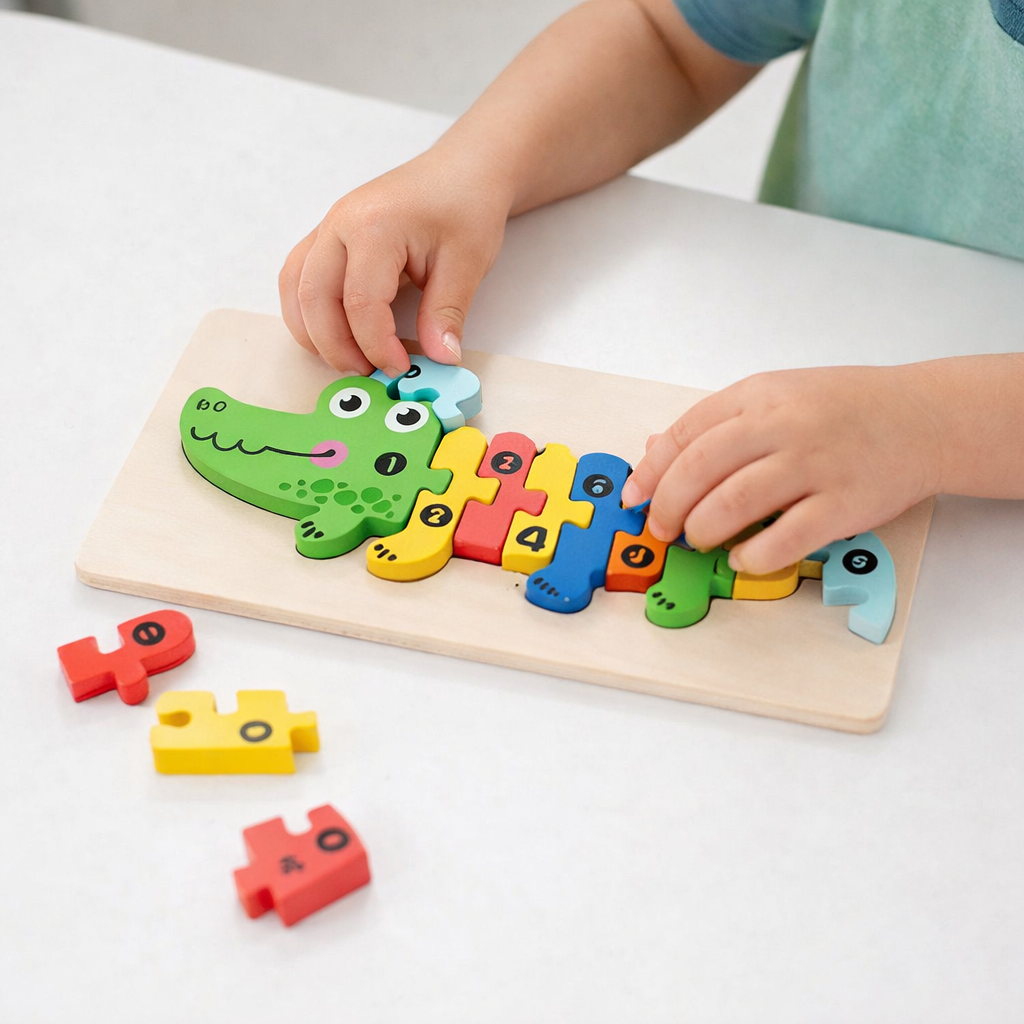 Quebra Cabeça Educativo Jacaré é um brinquedo ideal para estimular o desenvolvimento das crianças de forma divertida. Com peças de madeira que formam a figura de um simpático jacaré, o brinquedo incentiva os pequenos a montar a imagem enquanto exploram formas, cores, encaixes e sequencia numérica.